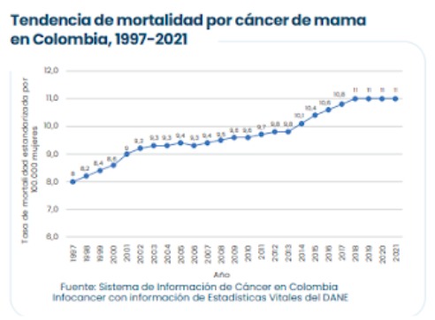 Según los análisis realizados por la Cuenta de Alto Costo (CAC), en el marco del aseguramiento en Colombia, al 31 de agosto de 2023 se han informado 107.181 casos prevalentes de cáncer de mama en las mujeres y durante enero de 2022 y enero de 2023, se reportaron 9.716 casos nuevos. Las regiones con mayor índice de cáncer de mama son Antioquia, Atlántico, Bolívar, Risaralda, Bogotá y Valle del Cauca.